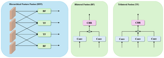 where denotes channel-wise concatenation, CBR represents a sequential combination of convolution, batch normalization, and ReLU activation, and both feature maps are aligned to the same spatial dimensions through bilinear interpolation when necessary. Specifically, we compute bilateral fusion features between two adjacent levels, resulting in and .