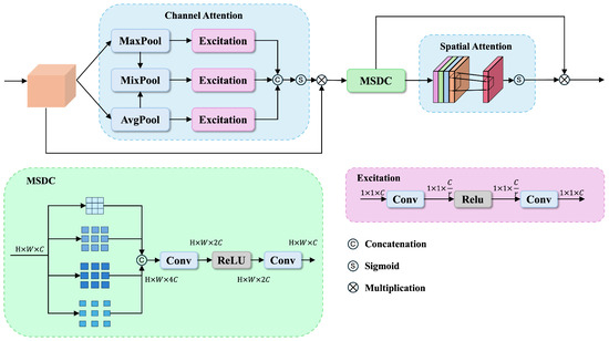 As illustrated in Figure 3, the DCSA consists of three key components: (1) Channel attention with dynamic pooling that adaptively integrates global average and maximum information, followed by Excitation modules consisting of two 1×1 convolution layers with a ReLU activation in between to capture channel dependencies; (2) Multi-scale dilated convolution (MSDC) that captures features at different scales through parallel dilated convolutions; (3) Spatial attention that emphasizes informative spatial regions. These components work together synergistically to enhance feature representations.