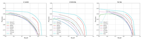 Quantitative Results. As shown in Table 1, our proposed IRFNet consistently outperforms existing methods across all datasets. Compared to HitNet [32], IRFNet achieves average improvements of 13.7% in MAE, 1.8% in , 0.9% in , and 1.8% in across all three datasets. When compared to the recent VSCode [45], our method demonstrates even more significant improvements, with average gains of 22.0% in MAE, 3.3% in , 2.5% in , and 7.3% in . The precision–recall curves in Figure 5 further illustrate our method’s superior detection performance, consistently maintaining higher precision across varying recall values. These substantial improvements across different metrics and datasets validate the effectiveness of our proposed approach.