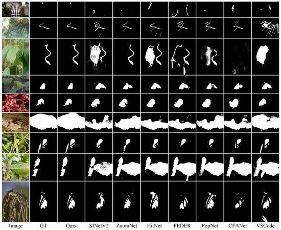 To demonstrate the effectiveness of our proposed IRFNet, we conducted comprehensive comparisons with fourteen state-of-the-art (SOTA) COD models, including SINet [19], TINet [38], C2FNet [22], PFNet [39], SegMaR [40], BGNet [23], PreyNet [41], SINetV2 [42], ZoomNet [21], HitNet [32], FEDER [24], CFANet [43], PopNet [44], and VSCode [45]. For fair comparison, all models were evaluated on the same benchmark datasets using identical evaluation metrics.