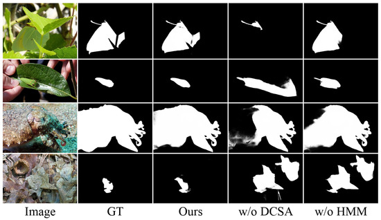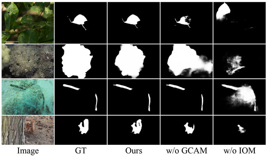 Qualitative Results. The visual comparisons in Figure 6 demonstrate IRFNet’s superior performance across challenging scenarios. For extremely fine-grained objects with minimal spatial extent (rows 1–3), our method successfully identifies targets that competing approaches struggle with. In cases of elongated structures such as snakes (rows 2–3), IRFNet accurately captures subtle occlusions and fine tail details that methods like ZoomNet [21] fail to detect. For medium-sized targets (rows 4–5), where other approaches mistakenly incorporate background leaves as part of the insect objects, our network maintains precise object boundaries. For larger objects such as the fish in row 6, it can be seen that existing methods only detect partial body segments, while our approach captures the complete structure. The bottom rows (7–9) showcase IRFNet’s capability in handling complex occlusion scenarios, where existing methods either misclassify occluding elements as part of the target or segment only portions of the object due to intermediate occlusions.