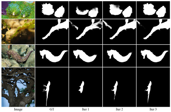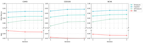 Given this finding, we further analyzed the progressive improvement within the three iterations of our optimal model. Table 8 shows the detailed progression of metrics through iterations, revealing consistent improvements across all datasets. For example, the MAE decreases from 0.053 to 0.047 on CAMO, 0.025 to 0.020 on COD10K, and 0.038 to 0.032 on NC4K. Figure 10 visualizes these improvements for all evaluation metrics, while Figure 11 provides qualitative examples showing how the prediction quality improves during iterations.