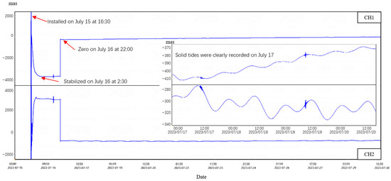 Figure 11 shows the original voltage value curve of the ICT-1 integrated chamber inclinometer after being installed for 3 months. From the curve, it can be seen that the ICT-1 integrated chamber inclinometer is also affected by temperature. After the equipment was installed on 15 July 2023, it first experienced significant drift. However, due to its small size and fast heat exchange, the drift slowed down after 10 h of installation, and a clear trend of solid tide can be observed, and the coseismic response can be recorded. On 16 July, the observers remotely zeroed the equipment. By 1 August, the observers determined that the drift had basically ended and formal observation could be carried out.