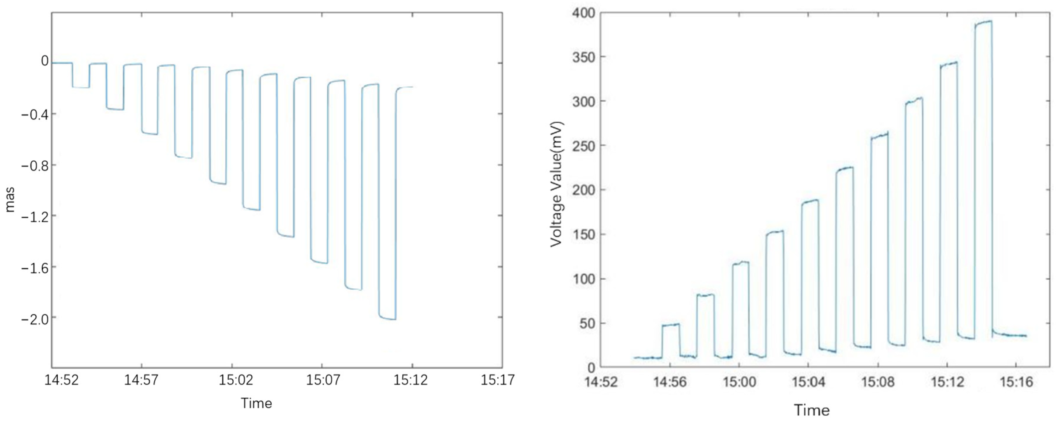 Using a high-precision tilt detection platform, laboratory calibration tests were conducted on the tilt measurement system. The platform was driven to create tilt changes at intervals of 10% of its full scale. Simultaneously, the tilt amount of the platform and the voltage output values of the ICT-1 tilt sensor were recorded. These data were used to calculate parameters such as the instrument’s sensitivity, range, linearity error, and other characteristics.