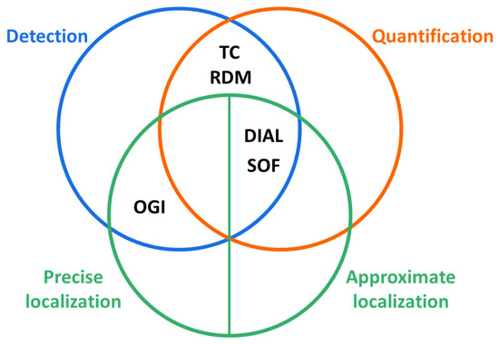 A quick way to choose the most appropriate technique is to evaluate the size of the source to be monitored. For instance, OGI is the best method for assessing fugitive emissions from pumps, valves, or flanges since it enables the identification and accurate localization of the emission source. Conversely, for monitoring large-scale diffuse emissions (i.e., tank farms, water treatment sections, or entire industrial sites), the most suitable techniques appear to be DIAL and SOF, which allow for the detection and quantification of emission sources, but only approximate the localization of the single source itself. Additionally, the TC and RDM techniques, valid to detect and quantify the emission rate, also allow for the approximate localization of emission sources when used in conjunction with OGI, as clearly stated in the EN 17628:2022 standard in sections 8.1.2.4 and 8.1.2.5. Therefore, the complementary nature of the described techniques is evident when a very detailed understanding of the emission scenario is necessary.