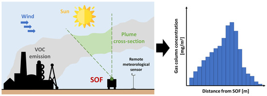 The SOF method is employed to map and measure gas emissions across various scales, ranging from entire sites to individual equipment. This method efficiently analyzes large sections of a facility and helps identify the most significant emission sources. The SOF technique relies heavily on direct sunlight and utilizes spectrometry to analyze the sunlight radiation through the atmosphere using a mobile system [51].