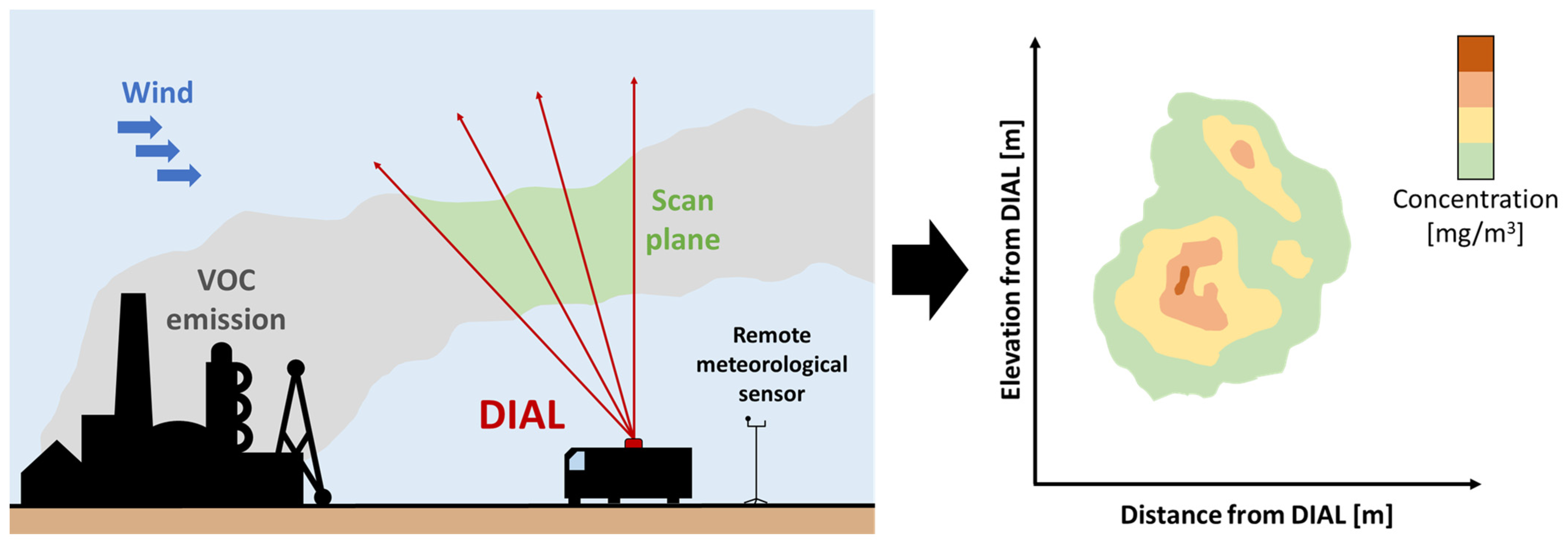 The DIAL is a method that uses laser sources in the infrared (IR) and ultraviolet (UV) regions to detect and quantify emissions of specific VOCs and the corresponding flows directly in the atmosphere [42].