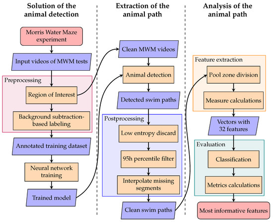 In this paper, we introduce our AI-based framework developed for the automated processing of videos captured during the MWM trials. Our aim is to develop a fully automated pipeline that can be used by biology researchers for the evaluation of the recorded MWM-test videos using some enhanced machine learning-based tools. The main steps of the proposed pipelines can be seen in Figure 1. As a first step (see the first column on the left), we develop the appropriate machine learning-based algorithm to detect the animals in the pool during each frame of the input videos. In the next step (see the middle part), the process moves forward with the output of the trained model, which is able to detect animal positions with high accuracy, and in this way, we can track the movement of the animals. From this result, we construct the swimming paths of the animals, which still require some postprocessing steps. The output of this phase is the cleaned swimming paths, which is accurate enough to consider its main features. As a last step, we extract some meaningful descriptors of the tracked movements which could be used for a classification task. This final step is improved by considering our proposed features, which also improves the final classification accuracy and reliability.