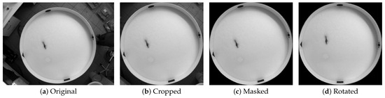 A frame of (a) the unprocessed raw video with the preprocessing steps: (b) cropping, (c) masking, and (d) rotating of the image.