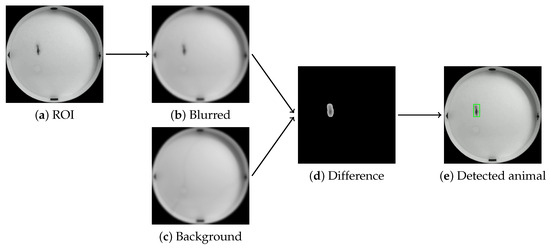 The process of detecting the animal in the image of the pool: (a) extracted ROI, (b) Gaussian blurred image, (c) precalculated comparing background, (d) differing image parts and (e) successfully detected animal.