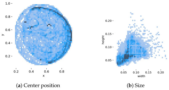 The dataset is divided into a training and a validation set at a ratio of 4:1 to assess the network’s recognition accuracy during the learning process. This leads to 25,728 frames being assigned to the training set out of a total of 32,163 annotated frames, while 6435 frames are designated for the validation set. Figure 5 illustrates the key characteristics of the bounding boxes in the training set. The properties of these bounding boxes are between 0 and 1 since YOLOv5 only accepts input values that have been normalized to the dimensions of the input images. Panel (a) displays the center positions, while panel (b) highlights the variation in bounding box size.