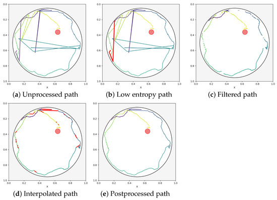 Path states (highlighted in red) during postprocessing: (a) unprocessed detected path from YOLOv5, (b) low-entropy discard at the start of the video, (c) filtering based on the 95th percentile, (d) interpolation where the segments are filtered out, and (e) the final postprocessed corrected path.