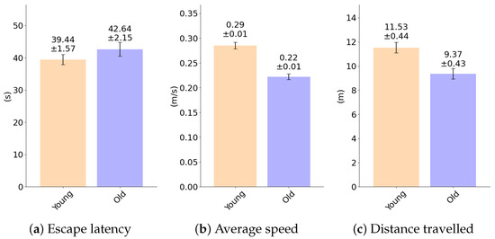 To provide better interpretation for the differences between the two age groups of the rats, let us show in Figure 8 the mean and standard error of mean (SEM) values calculated for some key metrics, such as escape latency (a), average speed (b), and distance traveled (c). These metrics support our hypothesis that younger rats outperform the older rats during the tests: they are faster to escape, swim at higher average speeds, and cover more distance in less time.