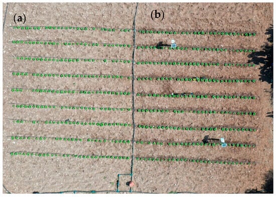 The experiment was carried out at CIHEAM Bari’s experimental field in Valenzano, located in the Puglia region of southern Italy (41°2′40.3872″ N, 16°53′3.8364″ E), between 2 May and 17 June 2024. The experimental area, measuring 15 m × 9 m, was divided into two plots, each 7.5 m × 9 m. The area was transplanted with Romaine lettuce (Lactuca sativa L.). Both plots were equipped with a drip irrigation system, with lines spaced 1 m apart and drippers (corresponding to plant positions) spaced 0.25 m apart. The drippers were self-compensating, with a flow rate of 2 L per hour. Each 16 mm lateral feeding the drippers was fitted with a small butterfly valve to allow the precise control of individual dripper lines, a crucial feature given the differing irrigation schedules between the plots. Figure 1 illustrates the experimental setup. One of the plots was irrigated according to an irrigation schedule based on the weather data acquired from an adjacent weather station, while the other was irrigated using the installed sensors. Figure 1 shows the actual field setup using a drone image. Given the relatively small scale of the experiment (135 m2), the impact of the soil spatial variability on the resulting yield was neglected.