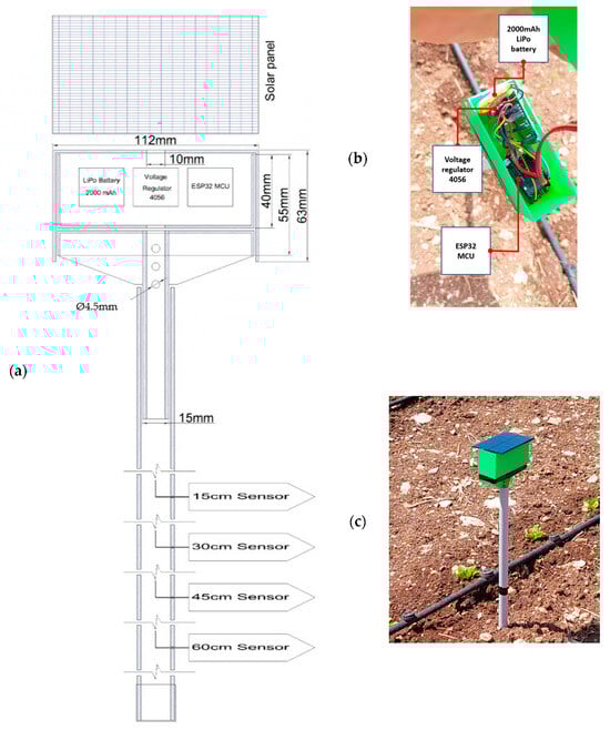 (a) The design of the developed prototype, (b) the components of the measurement unit, and (c) the installment in the field.