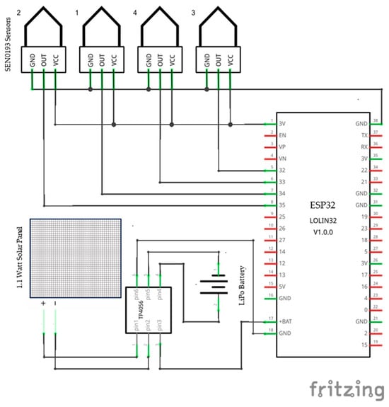 The IoT soil moisture content probe integrated four SEN0193 capacitive soil moisture sensors with an ESP32 Lolin (WEMOS, Shenzhen, China) MCU (microcontroller unit) connected to GPIO (general purpose input/output) numbers 32, 33, 34, and 35. The prototype was enhanced with a solar-charging circuit using a TP4056 (ASIC Corp, Nanjing, China ) voltage regulator, a 2000 mAh LiPo battery, and a 2.5-Watt/5 V solar panel.
