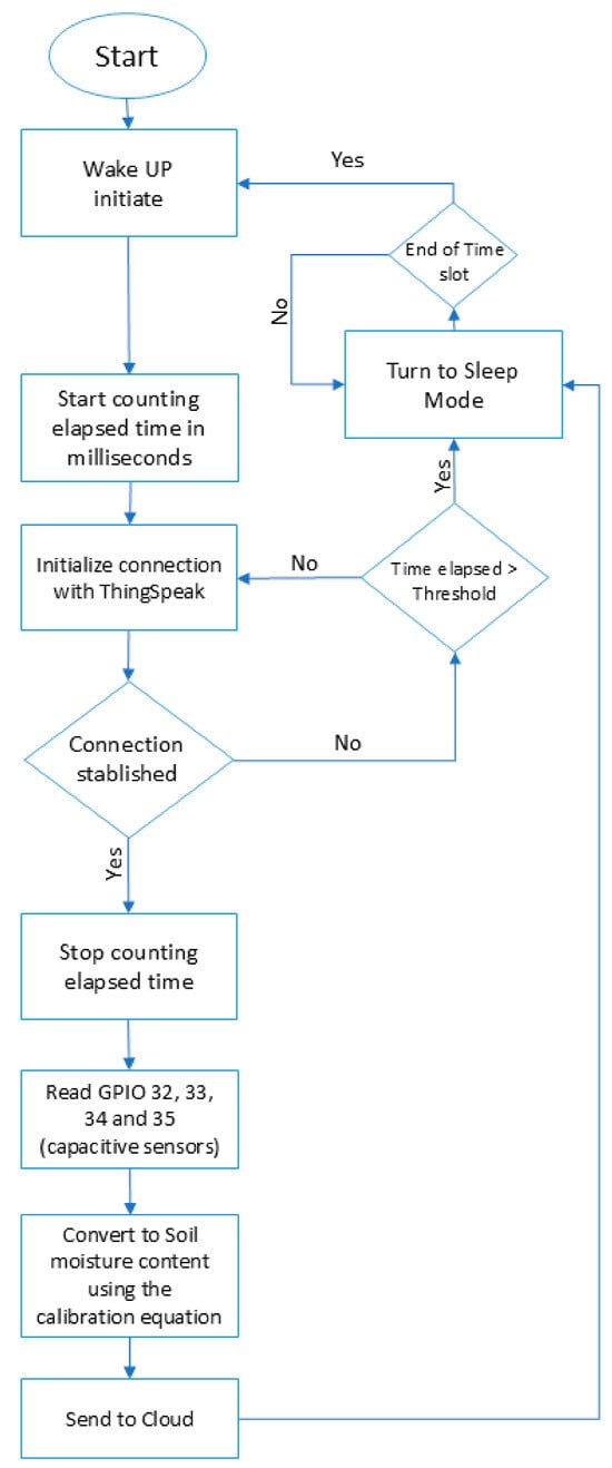 Figure 4 shows how the algorithm works. Developed in C++ using the Arduino IDE, the algorithm works as follows: every six hours (referred to as the “time slot” in the flowchart), the ESP32 exits its sleep mode in an attempt to measure the soil moisture content. If successful, it transmits three data points to the ThingSpeak cloud platform using its built-in Wi-Fi module and then enters sleep mode again to conserve energy. If the microcontroller unit (MCU) cannot connect to a network within 30 s (the “threshold” indicated in the flowchart), it transitions back to sleep mode.