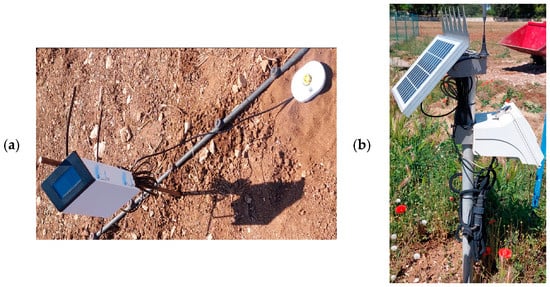 One of the secondary objectives of this study was to compare the developed soil water profile sensor with other commercial alternatives. Thus, two similar commercial soil water content probes were installed in the field. The first was a TEROS 54 (METER Group, Pullman, WA, USA) (Figure 5a), which determines the volumetric water content (VWC) of soil using capacitance-based technology. It works by identifying changes in the soil’s dielectric constant, which is a measure of its water content. It additionally considers temperature variations to ensure precise readings under diverse conditions. The sensor was positioned in the IoT plot in row 5, adjacent to the developed IoT capacitive soil moisture sensor. Meanwhile, the second was a SENTEK drill & drop (Sentek, Adelaide, Australia) (Figure 5b), which uses two electrodes that are placed in the soil to measure the changes in capacitance that take place as the soil’s water content varies, since the dielectric qualities of water are influenced by the soil’s moisture level. Two Drill & Drop sensors were placed diagonally in the IoT plot in rows 2 and 8.