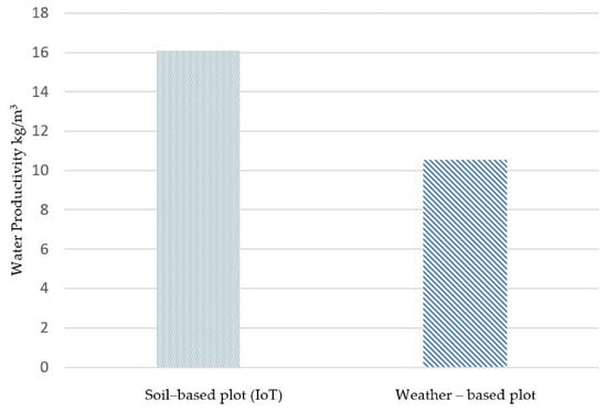 In terms of water productivity, the soil monitoring-based plot (equipped with the IoT prototype) was higher by 52% compared with the weather-based field, as shown in Figure 6. The percentage of the fresh marketable yield increment was not too high, recording 101.8 kg in the IoT plot compared with 93.8 kg in the weather-based one, yet the significant variable was the amount of water applied. In the IoT-based field, a total of 6.3 m3 was applied during the season compared with 8.9 m3 in the weather-based plot. These findings align with studies investigating soil moisture sensor-based irrigation scheduling and its impact on water use efficiency. As pointed out by [], precision irrigation systems, while not always leading to dramatic yield increases, significantly improve water productivity, making them particularly valuable in water-scarce regions. The reduction in water consumption also aligns with [], which reported precision irrigation systems using the IoT, and wireless sensor networks (WSNs) led to a 20–30% reduction in water usage compared with conventional methods.