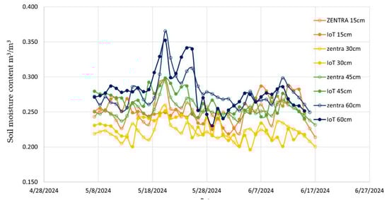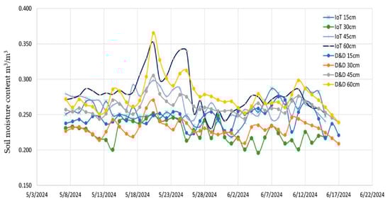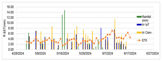 Figure 7 shows how the IoT-based plot was dynamically aligned with the variation in the reference evapotranspiration compared with the weather simulation scheduling. The IoT system is better positioned to optimize water usage, which could lead to more sustainable and effective agriculture activities, by directly responding to daily ET0 values. The rainfall peak was relevant for two days (18 and 19 of May 2024), with an intensive rainfall amount of 14.75 mm on 19 May and 11.33 mm on 10 June as well. Additionally, the lower irrigation volumes supplied were also due to the soil characteristics (i.e., a silt-loamy but stony soil with approximately 25% stones, lying on bedrock at 70 cm). To con clude, irrigation based on the actual soil water content fluctuation combined with IoT soil water content-monitoring systems proved to be more efficient. It is worth mentioning that the experiment was carried out on a silty loam soil, and the capacitive sensors were calibrated for it, so other soil textures with different water retention characteristics will impact the water dynamics. Additionally, variations in temperature, humidity, and evapotranspiration rates in different regions may affect the overestimation of the reference evapotranspiration, thus impacting the weather-based simulation models.