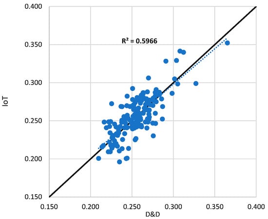 The developed prototype demonstrated a comparable performance, achieving a coefficient of determination (R2) of 0.58 when tested against the TEROS 54 and an R2 of 0.6 compared with the Drill & Drop sensor, as illustrated in Figure 10 and Figure 11, respectively. Notably, unlike the commercial alternatives, the prototype was specifically calibrated for the soil type used in this study, whereas commercial sensors typically rely on generalized calibration functions designed to accommodate a range of soil textures.