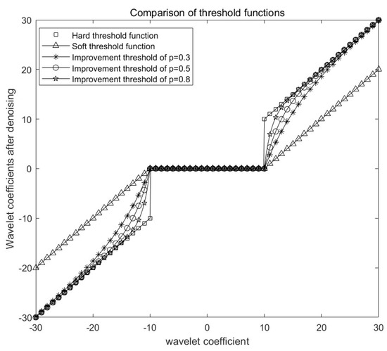 According to the above asymptotic line analysis and continuity analysis of the improved exponential threshold function, it shows that the improved threshold function better avoids the Gibbs phenomenon and does not oscillate in the wavelet inverse transform process. It can suppress reconstruction oscillation and reconstruction deviation and effectively suppress noise while preserving the effective information of the original signal. In order to facilitate the comparison of the trends of the threshold function curves, the comparison graphs of the improved exponential threshold function generated by adjusting the parameters p = 0.3, 0.5, and 0.8 are shown in Figure 1.