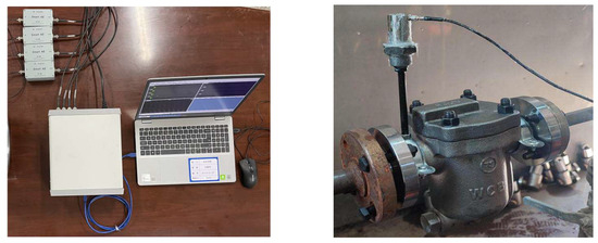 The acquisition system primarily consists of a steam trap, four acoustic emission sensors, a multichannel high-frequency acoustic emission collector, four pre-signal amplifiers, and a PC terminal. Figure 3 shows a field diagram of the steam trap signal acquisition experiment.