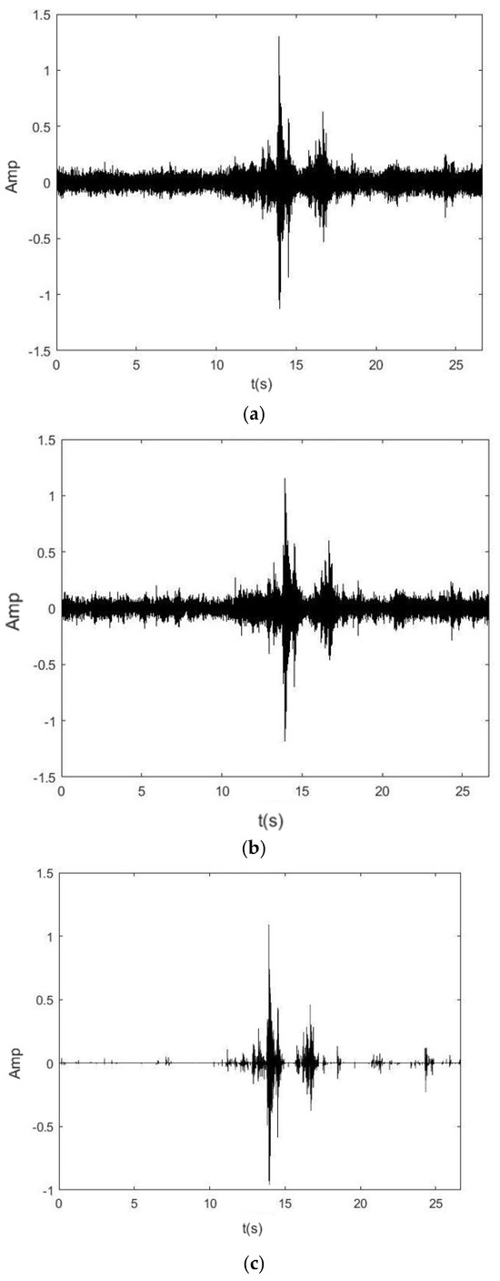 The VisuShrink generic threshold is proposed based on the noise having an independent homogeneous distribution, while the Rigrsure adaptive threshold is obtained based on the minimum amount of risk from Stein’s unbiased likelihood estimation. The Heursure heuristic threshold combines the advantages of the two thresholds; it selects the generic threshold when the signal-to-noise ratio is low; it selects a better threshold when the signal-to-noise ratio is high by comparing a fixed threshold and an unbiased likelihood estimation of the threshold, and it chooses the better threshold of the two; the expression is shown in Equation (18).