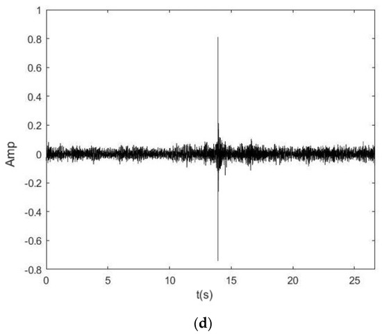 Time domain graphs after noise reduction. (a) The hard threshold function denoising time-domain graph; (b) The soft threshold function denoising time-domain graph; (c) The improved wavelet threshold function denoising time-domain graph; (d) Joint SSA-VMD and the improved wavelet threshold denoising time-domain graph.