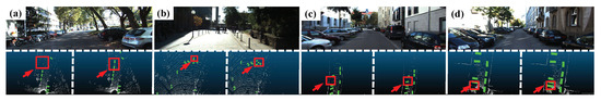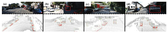 However, Figure 4 highlights certain limitations. First, the missed detections of certain object categories in Figure 4a (e.g., trucks) are due to the limitations of the dataset annotation protocol, which fails to provide labels for these classes and, thus, prevents the model from learning discriminative features for them. Second, Figure 4b shows missed detections for small or heavily occluded objects, mainly because of sparse point clouds (e.g., fewer LiDAR points generated by distant pedestrians) and the disruption of geometric continuity caused by occlusion, making it difficult for the model to extract effective features. Additionally, in Figure 4c, vertically oriented objects (such as poles) are misclassified as pedestrians or cyclists because of their geometric similarity to these classes in LiDAR point clouds and the model’s insufficient awareness of global scene contexts. Finally, the over-segmentation issue in Figure 4d indicates that a single object is split into multiple detections, which is likely because the pillar feature encoding fails to fully capture the relationships between adjacent pillars, especially for large or irregularly shaped objects.