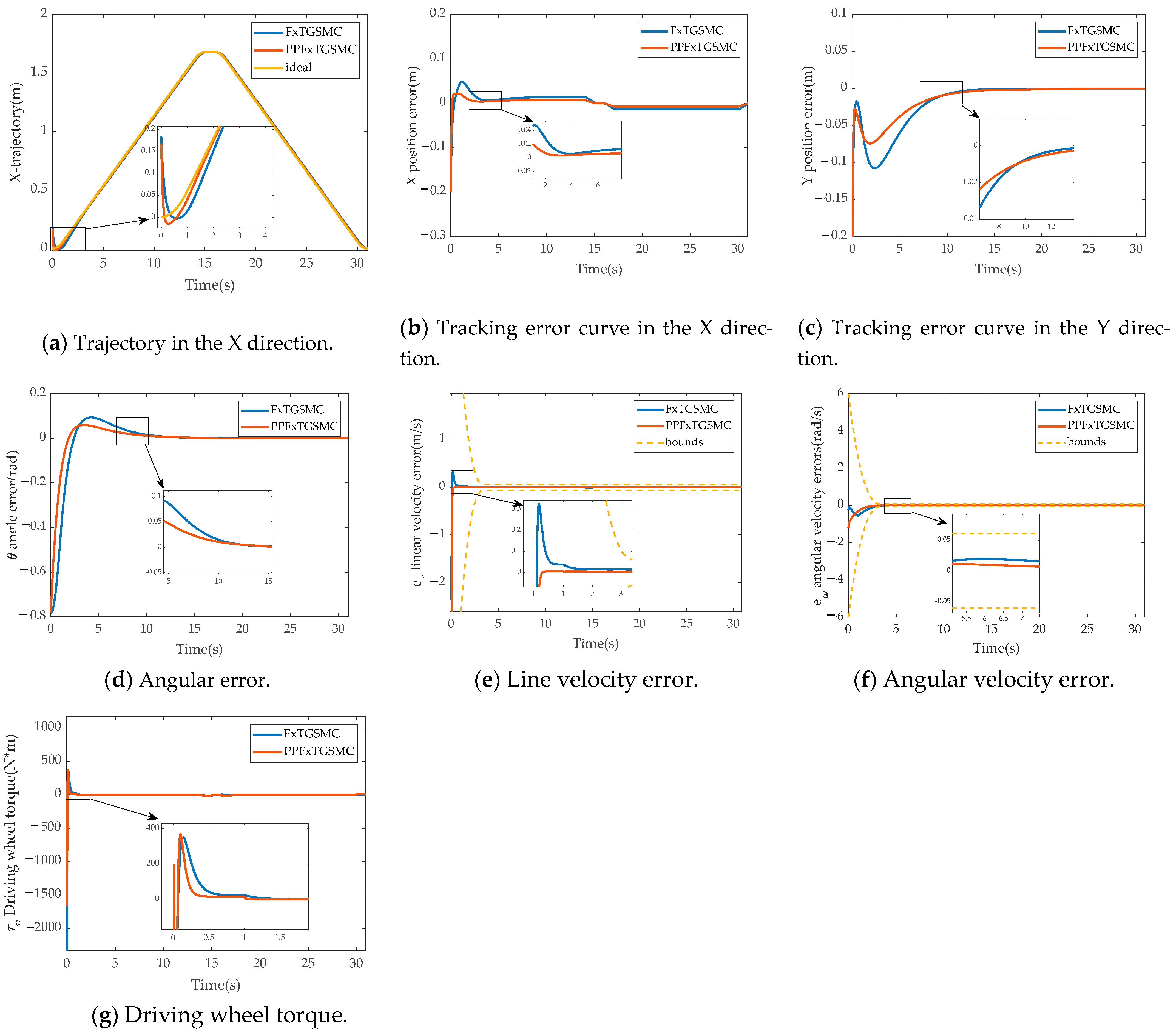 Comparison results of simulation experiments between FxTGSMC and PPFxTGSMC. (a) Trajectory in the X direction. (b) Tracking error curve in the X direction. (c) Tracking error curve in the Y direction. (d) Angular error. (e) Line velocity error. (f) Angular velocity error. (g) Driving wheel torque.