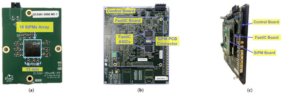 (a) PCB containing the 16-SiPM array; (b) FastIC evaluation kit; (c) side view of the SiPM array connected to the FastIC evaluation kit.