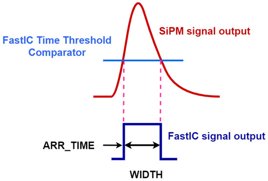 Scheme showing how FastIC’s high-rate mode processes SiPM signals. FastIC produces a single binary pulse. The rise time of this binary pulse gives the arrival time of the signal (ARR_TIME). The pulse width (WIDTH) is given by the signal time over threshold and is thus related to the signal amplitude.