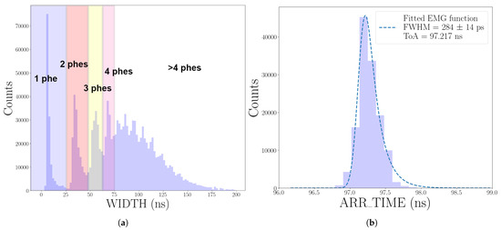 Figure 5 shows the results of an SPTR measurement for one of the channels of the 16-SiPM array, recorded as described in Section 2.2.1. Here, ARR_TIME is the time difference between the trigger from the laser driver and the time measured by FastIC. We first consider the WIDTH distribution shown in Figure 5a). The first four peaks correspond to events of one (peak at ∼6 ns), two (∼34 ns), three (∼55 ns), and four (∼68 ns) phes. The peaks are harder to distinguish when the signal is larger due to the non-linear nature of the FastIC operation mode employed (see Section 2.1). Figure 5b) shows the ARR_TIME distribution of single-phe events, fitted with an EMG function. The SPTR obtained, defined as the FWHM of the fitted function, was ps. This result includes all contributions to the time resolution (laser, SiPM, and read-out electronics). However, in this case, the contribution from the laser, which has a pulse width of a few tens of ps, is negligible.