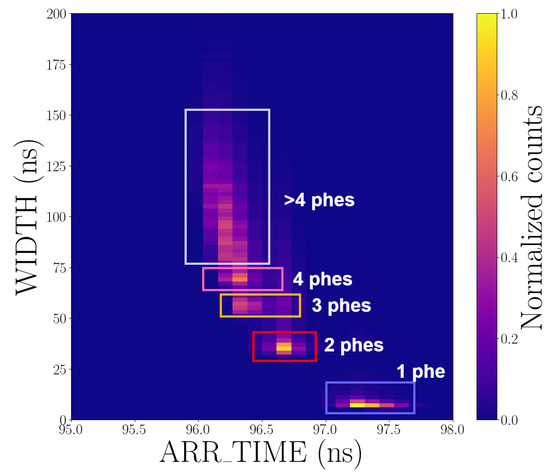 Figure 6 shows a two-dimensional histogram of the WIDTH and ARR_TIME values, revealing a correlation between the ARR_TIME and WIDTH, namely, that the mean time of arrival (ToA) is longer for smaller signals. This time-walk effect is intrinsic to systems that employ a leading-edge discriminator to extract arrival times [51]. When required, simple correction algorithms can be applied to compensate for this effect [46,52,53]. The correlation plot also shows that the spread of arrival times is larger for weaker signals. As a result, the time resolution of SiPMs typically improves with the intensity of the incoming flux.
