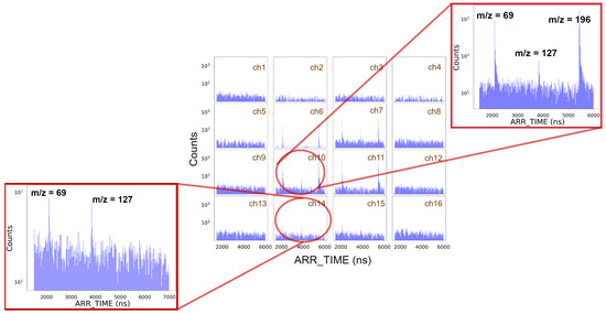 Figure 7 shows an example of the CF3I photofragment ion time-of-flight spectra recorded by each SiPM. Here, ARR_TIME is the time difference between the trigger from the clock divider and the time measured by FastIC. The three observed peaks correspond to the fragment ions () and I+ () and the parent ion CF3I+ (). The parent molecular ion is detected only in the central channels (6, 7, 10 and 11) because it retains the narrow transverse velocity distribution of the supersonic molecular beam, as explained in Section 2.2.2. On the other hand, the fragment ions show a wider spatial distribution (see channels 14 and 15), especially the I+ fragment, due to their characteristic scattering distributions resulting from the dissociation event [54,55]. As pointed out in Section 2.2.2, the FastIC time comparator threshold was set to detect the single-phe signal. Thus, the background shown in Figure 7 can be attributed to SiPM optical noise, namely, dark counts and cross-talk. We attribute the differences in background between channels (e.g., between channels 6 and 1) to variations in the FastIC time comparator thresholds across channels.