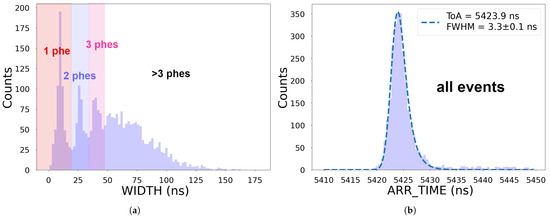 Example of the distributions obtained after an SPTR measurement with one channel of the SiPM array. (a) WIDTH distribution of all the events. (b) ARR_TIME distribution for single-phe events.