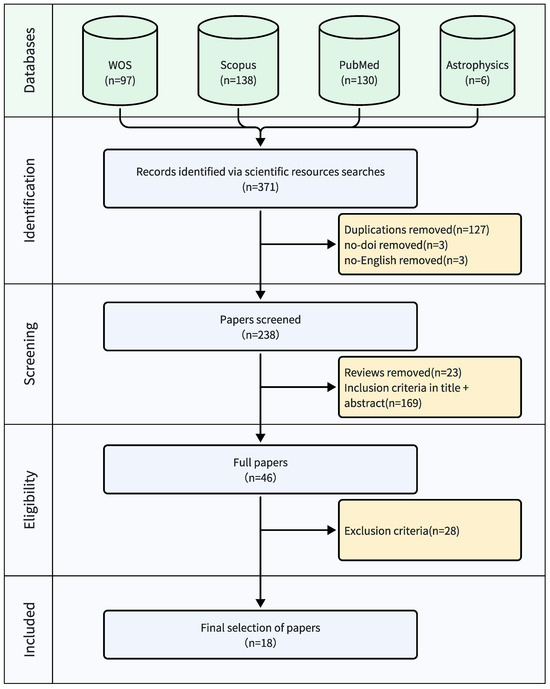 A diagram explaining PRISMA can be seen in Figure 2. We found 371 papers through our search on different databases: 97 papers on WOS, 138 papers on Scopus, 130 papers on PubMed, and 6 papers on Astrophysics Data System. After removing duplicates and papers without DOIs or written in languages other than English, 238 papers were left for the first screening. A total of 23 articles were excluded at this stage, and 169 papers were excluded as they did not meet the criteria of “Applying Deep Learning-based Computer Vision for Camera Depth Sensor-Based Physiotherapy Movements Assessment”. In the second screening, 46 articles were analyzed, of which 18 papers were finally selected for this systematic review as shown in Table 3.