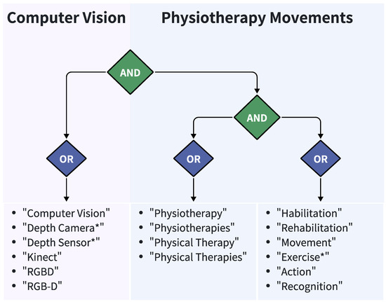 In the literature search, the authors used different search strategies, and the search process followed a combination of computer vision and physiotherapy movements to identify and retrieve keywords. When identifying keywords, the researchers set the logical operator between the fields of computer vision and physiotherapy movements to AND to ensure that the retrieved literature covered both fields. In addition, the authors also combined the logical AND between physical therapy and movement or rehabilitation in the physical therapy domain, and the final search strategy architecture is shown in Figure 3 and in Table 2.