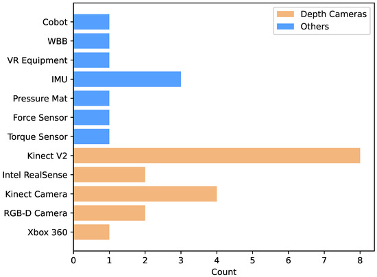 In addition, three papers [27,32,37] used ordinary RGB cameras and other RGB-D cameras (e.g., Xtion Pro, ASUS, Taipei, Taiwan) to collect data. This approach has low hardware requirements but requires the development of appropriate algorithms to process and analyze the data.