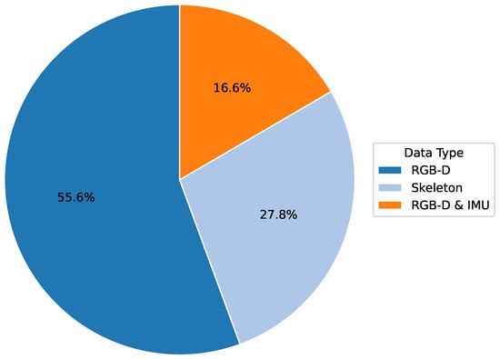 In computer vision-based physiotherapy movement assessment research, datasets are a key driver for its development. High-quality and diverse raw data and labeled information are the basis for developing excellent deep-learning models. At the same time, these datasets support the ability of the models to generalize across different application scenarios, facilitating the establishment of standardized physiotherapy movement assessment methods. In the reviewed literature, researchers used a variety of data types (see Figure 6), as shown in the following: