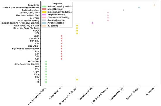 Existing studies adopted various approaches to dataset construction (see Table 5), including public datasets, self-constructed datasets, and dataset fusion. Most studies [8,10,11,12,15,16,30,32,33,34,35,37] relied on self-constructed datasets. The size of the datasets ranged from tens to hundreds of participants, with some small to medium datasets and some larger datasets, such as Girase et al. [34], which contained 411 participants. In data collection and construction, researchers generally consider data from people of different ages, genders, and health conditions. This diversity enhances the robustness of the physical therapy movement dataset and improves the ability to generalize the model.