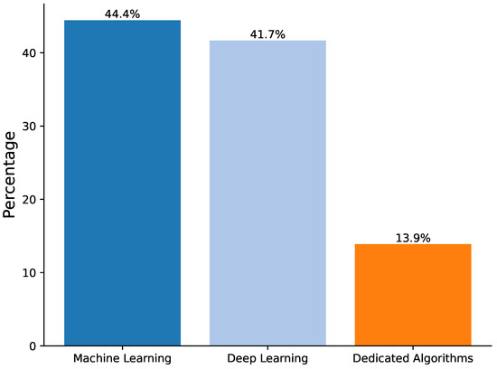 From an algorithmic perspective, the field showed a balanced distribution between traditional machine learning methods (44.4%) and deep learning models (41.7%), with specialized dedicated algorithms accounting for the remaining 13.9%. Convolutional neural networks emerged as the predominant deep learning architecture, while random forest and support vector machines were the most commonly used traditional approaches.