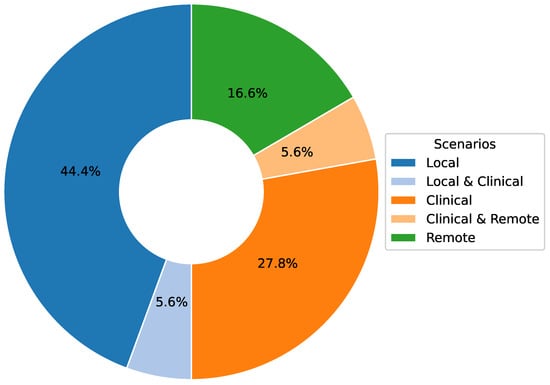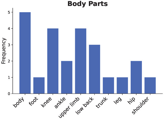 The applications primarily focused on local environments (50%) followed by clinical settings (33.4%), with remote rehabilitation representing a smaller portion (22.3%). The research concentrated on assessing movements of the upper limbs, lower back, knees, and whole-body motion, with implementations varying across rehabilitation, assessment, and movement analysis applications.