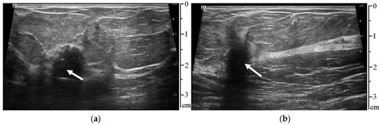 Frames from two different ultrasound video sequences; the arrows indicate (a) histologically proven mucinous breast cancer; and (b) histologically proven ductal breast cancer.