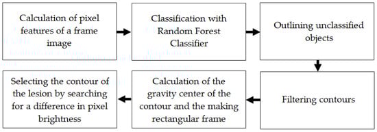 The developed method involves frame-by-frame processing of the video sequence and includes two stages of processing US images. In the first stage, normal tissue (background) classification is performed, the suppression of which highlights the region of interest (ROI) in the image containing the suspicious lesion and determines the approximate center of the lesion itself. When developing the first stage, the authors assumed that by classifying normal breast tissues in the image, in the presence of a pathological lesion, there would remain image pixels that would either not be classified as normal tissues or would be classified as such with low probability. That is, the task of determining the ROI containing the lesion can be considered as an inverse problem. The implementation of this stage is based on the classification of normal breast tissues in the image, for which a machine learning methodology was applied—a random forest classifier with the Gini criterion [10].