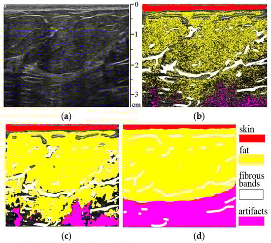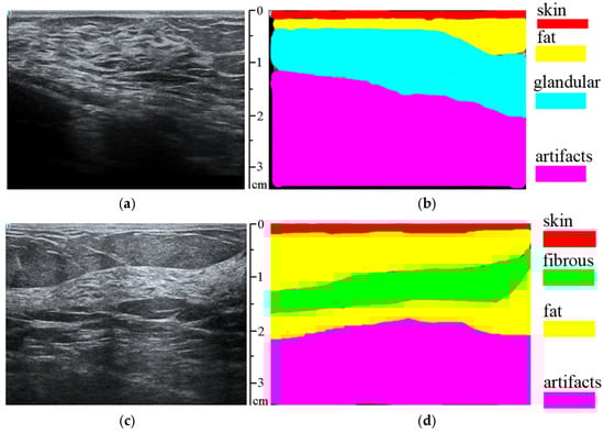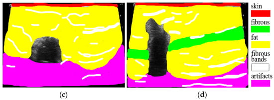 (a,c) Original ultrasound images; (b,d) ultrasound images with marked tissues on them (skin, fat, fibrous tissue, glandular tissue, and artifacts).