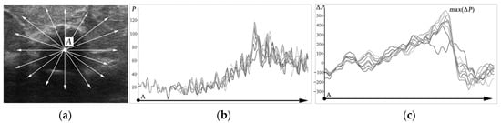 (a) Rays drawn from the center of lesion A; (b) brightness values of the pixels Pi lying on the rays; (c) graphs of the brightness gradients ΔPi of the pixels lying on the rays.