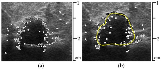 Areas of significant noise, strong blur, and poor contrast may be characterized by the absence of a strong brightness gradient change at the boundary of the breast lesion, which can indeed complicate the subsequent segmentation of the lesion. To minimize such errors, it is essential to apply adaptive approaches that can adjust parameters based on the assessment of the input image quality. For example, if the noise level is high, the algorithm may modify the gradient weights or the size of the window used for its calculation. Additionally, the methodology proposed in the paper uses averaging of regression lines constructed for the previously identified points of lesions, which also helps to minimize the error.