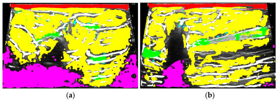 From Figure 4b, it can be seen that after automatic tissue classification, there are a few unmarked pixels that were not classified into one of the groups due to having a low probability of belonging. Therefore, to avoid this drawback, the morphological dilation operation is applied to merge the unmarked pixels, along with a median filter to eliminate false “outliers”—incorrectly marked points (see Figure 4c). These filters are applied to the obtained classified image masks.